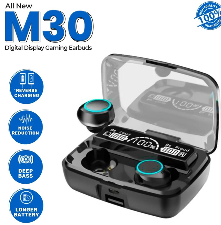 هندزفری بلوتوثی نسل جدید M30 علاوه بر ظاهر زیبا وجذاب اندازه کوچکتر وسبک تری دارد همچنین این محصول از بلوتوث نسل پنجم بهره می برد که مکالمه ای با کیفیت تر ودل نشین تر در اختیار استفاده کنندگان این محصول قرار داده و سرعت اتصال بالایی دارد.به علاوه این مدل دارای فناوری TWS می باشد فناوری استریو واقعی کیفیت مطلوبی در اختیار علاقه مندان به شنیدن موسیقی با کیفت و دوست داران بازی های یارانه ای قرار میدهد.علاوه بر این این هندزفری با باطری پاوربانک 300Ma سرعت بالایی در شارژ گوشی ها داشته و همچنین می توانید از آن به عنوان یک پاوربانک با قدرت برای شارژ گوشی خود استفاده کنید.ظاهر زیبا و جذاب این دستگاه بسیار چشم نواز می باشد.شما می توانید با مشاهده صفحه LED زیبای آن از مقدار شارژ پاوربانک و گوشی های هندزفری خود مطلع شوید.همچنین گوشی های کوچک و بسیار سبک این مدل کاملا لمسی است و میتوان با لمس آن گوشی ها را خاموش و یا روشن نمود همچنین میتوان به راحتی با لمس گوشی ها می توان وصل وقطع مکالمه و یا شروع و توقف موسیقی را کنترل نمود و حتی به راحتی با دوبار لمس هر طرف موسیقی قبل یا بعد را پخش کرد.همچنین این هندزفری مجهز به فناوری enc میباشد که باعث حذف نویز میشود